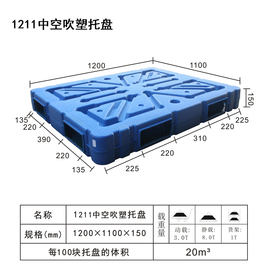| Color | Low blue,blue | Dynamic load | 3T | Material | PP,PE | Model | Four-way | Scope | Warehousing and logistics industry | size | 1200×1100×150 | Static load | 8T | Type | Blow molded | 100 volume | 20m³ | Shelf | 1T |
