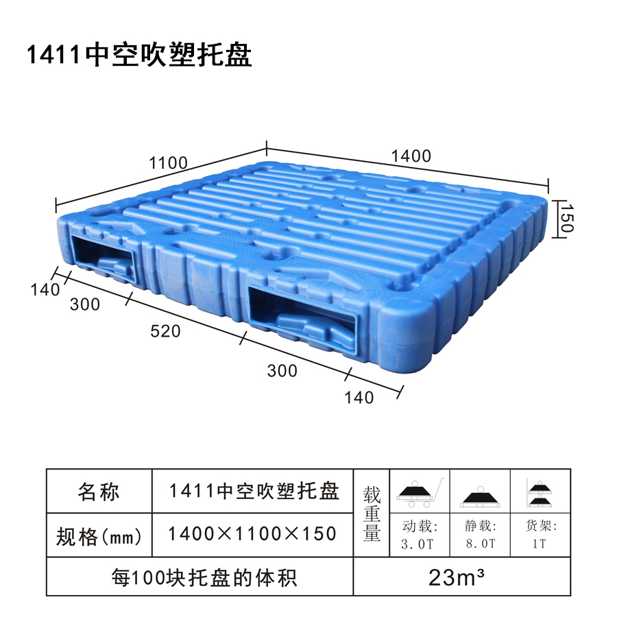 | Color | Low blue,blue | Dynamic load | 3T | Material | PP,PE | Model | Four-way | Scope | Warehousing and logistics industry | size | 1400×1100×150 | Static load | 1400×1100×150 | Type | Blow molded | 100 volume | 23m³ | Shelf | 1T |
