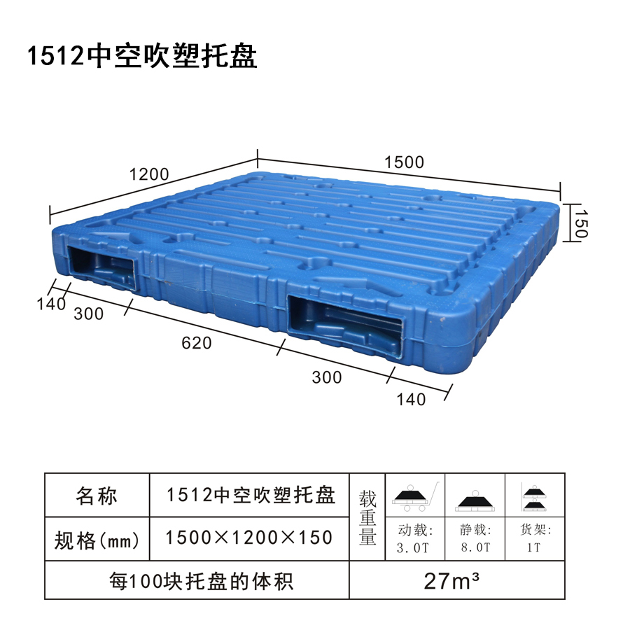 | Color | Low blue,blue | Dynamic load | 3T | Material | PP,PE | Model | Four-way | Scope | Warehousing and logistics industry | size | 1500×1200×150 | Static load | 8T | Type | Blow molded | 100 volume | 27m³ | Shelf | 1T |