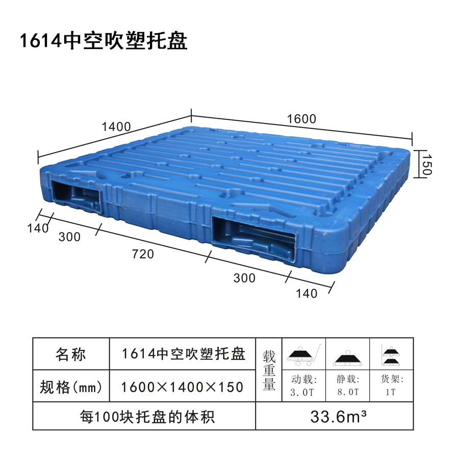 | Color | Low blue,blue | Dynamic load | 3T | Material | PP,PE | Model | Four-way | Scope | Warehousing and logistics industry | size | 1600×1400×150 | Static load | 8T | Type | Blow molded | 100 volume | 33.6m³ | Shelf | 1T |