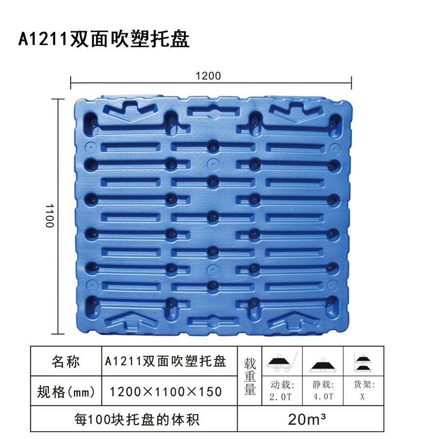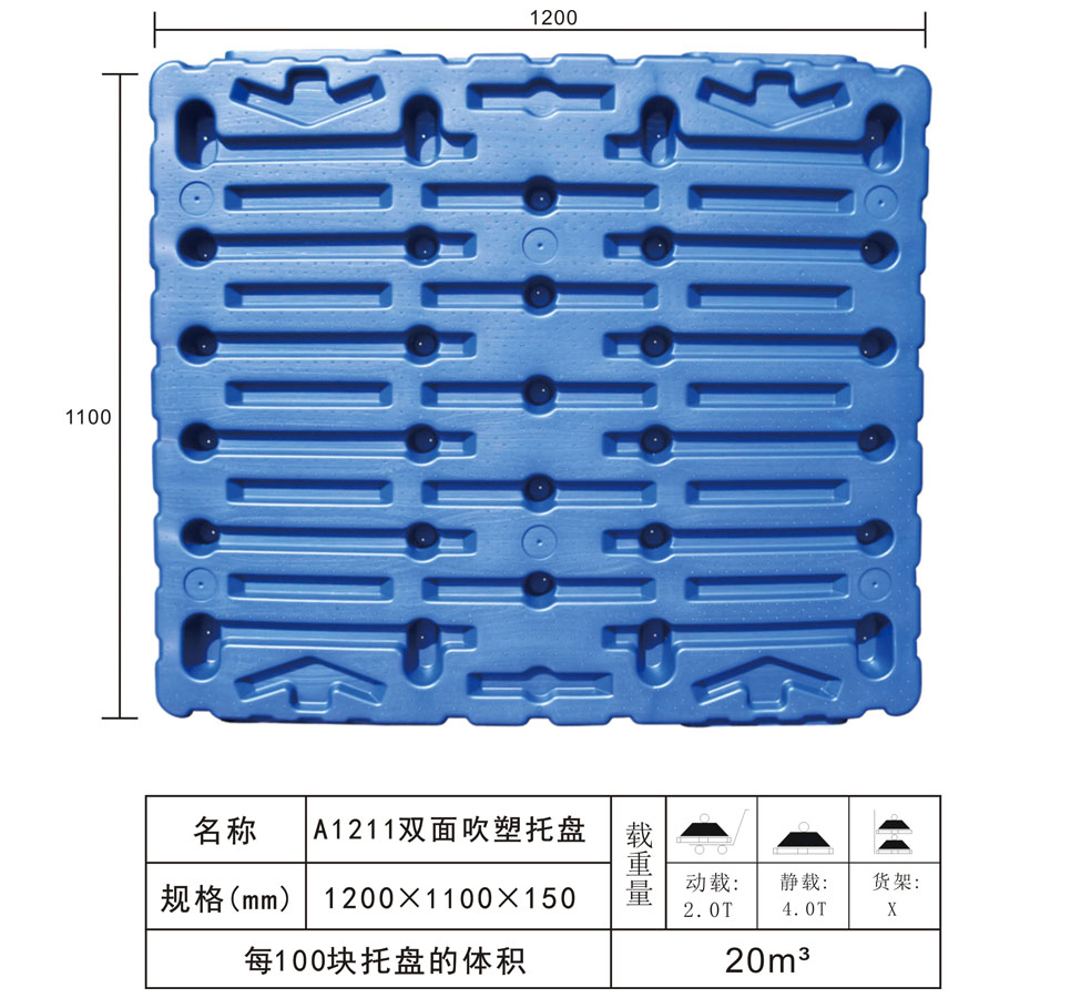 | Color | Low blue,blue | Dynamic load | 2T | Material | PP,PE | Model | Four-way | Scope | Warehousing and logistics industry | size | 1200×1100×150 | Static load | 4T | Type | Blow molded | 100 volume | 20m³ | Shelf | X |