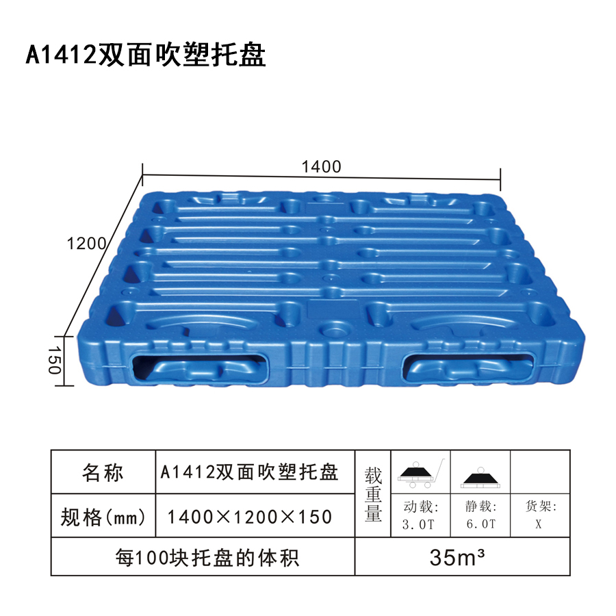 | Color | Low blue,blue | Dynamic load | 3T | Material | PP,PE | Model | Four-way | Scope | Warehousing and logistics industry | size | 1400×1200×150 | Static load | 6T | Type | Blow molded | 100 volume | 35m³ | Shelf | X |