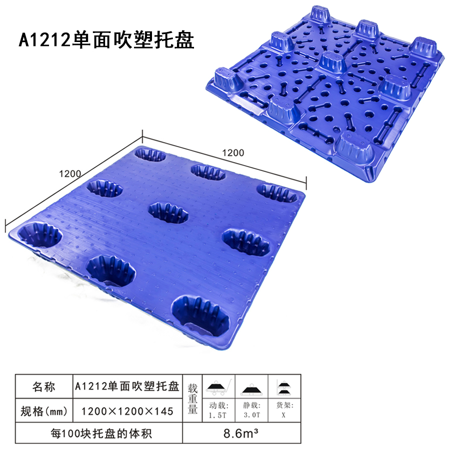 | Color | Low blue,blue | Dynamic load | 1.5T | Material | PP,PE | Model | Four-way | Scope | Warehousing and logistics industry | size | 1200×1200×145 | Static load | 3T | Type | Blow molded | 100 volume | 8.6m³ | Shelf | X |