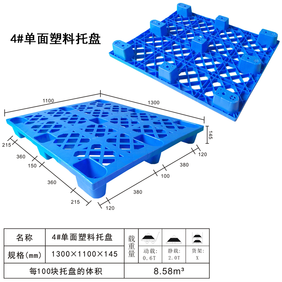 | Color | Low blue,blue,yellow,black,green,red,white,grey,other | Dynamic load | 0.6T | Material | PP,PE | Model | Four-way | Scope | Food pharmaceutical and chemical industries such as textile parts factory warehouse logistics transportation | size | 1300×1100×145 | Static load | 2T | Type | Single side | 100 volume | 8.58m³ | Shelf | X |