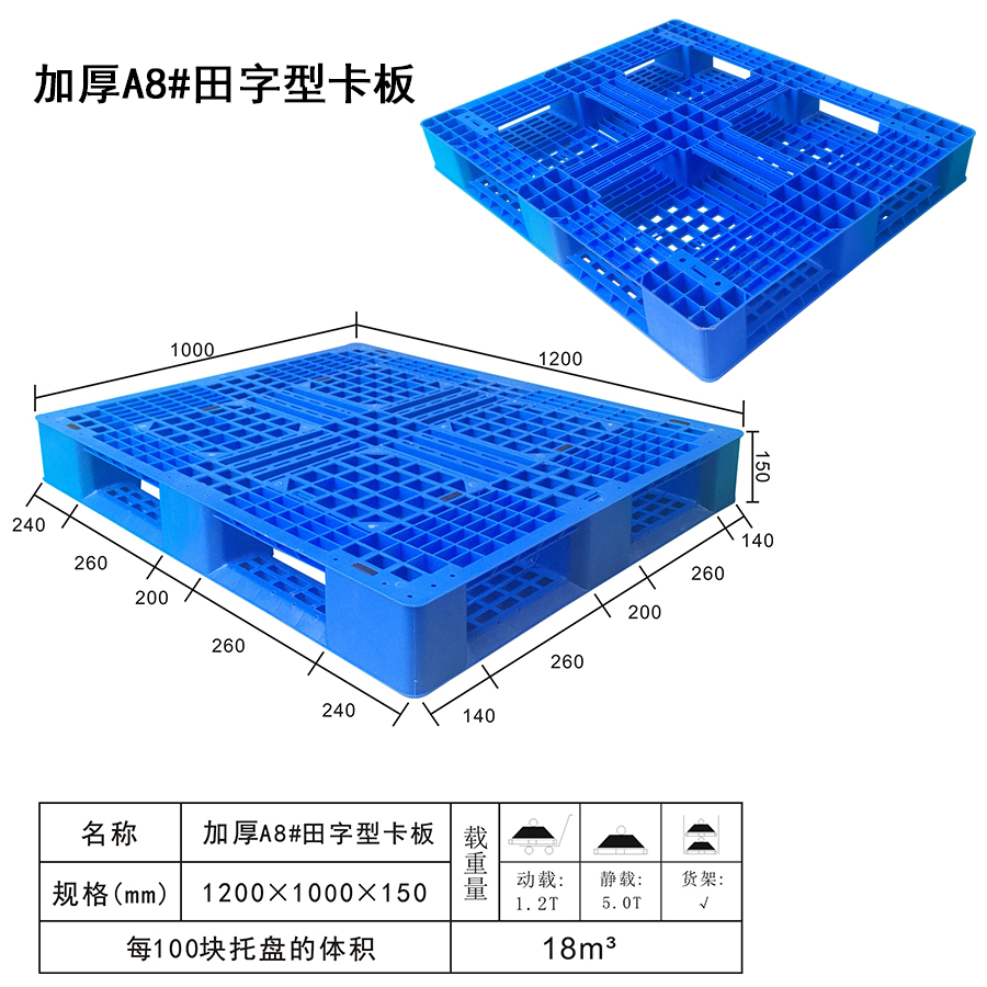 | Color | Low blue,blue,yellow,black,green,red,white,grey,other | Dynamic load | 1.2T | Material | PP,PE | Model | Four-way | Scope | Container, stacking, handling and transport of goods placed, import and export trade, warehousing and logistics | size | 1200×1000×150 | Static load | 5T | Type | Tian word | 100 volume | 18m³ | Shelf | √ |