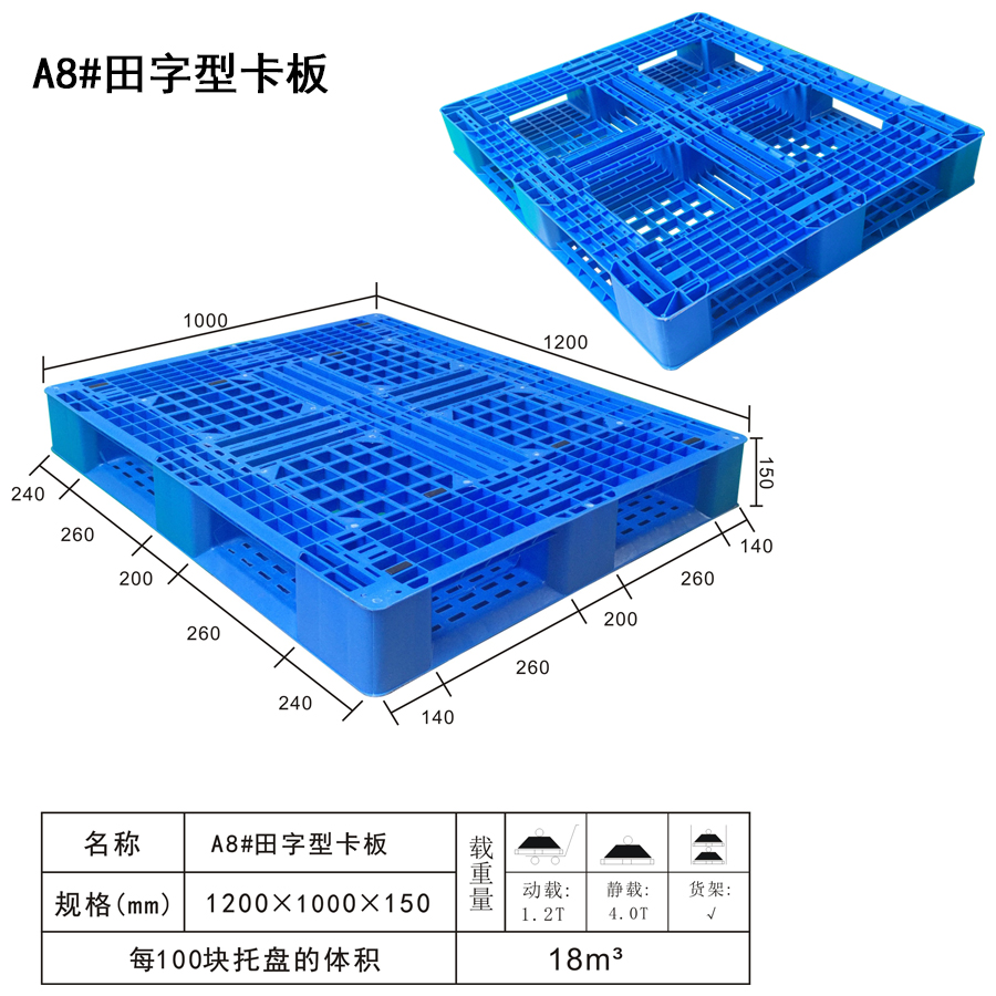 | 可选颜色 | 低兰,兰,黄,黑,绿,红,白,灰,其他 | 动载 | 1.2T | 材料 | PP,PE | 型式 | 四面进叉 | 适用范围 | 集装、堆放、搬运和运输货物放置、进出口贸易、仓储物流上等 | 尺寸 | 1200×1000×150 | 静载 | 4T | 类型 | 田字 | 百个数量体积 | 18m³ | 货架 | √ |
