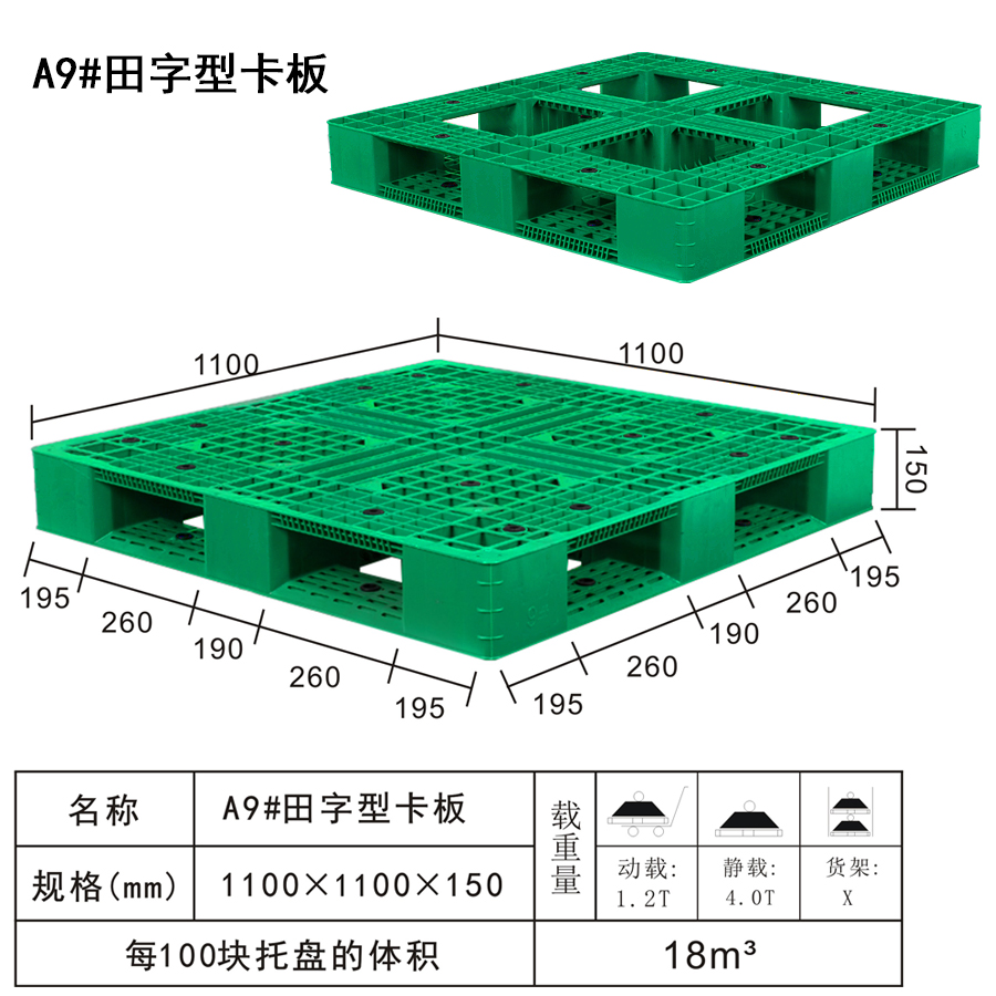 | Color | Low blue,blue,yellow,black,green,red,white,grey,other | Dynamic load | 1.2T | Material | PP,PE | Model | Four-way | Scope | Container, stacking, handling and transport of goods placed, import and export trade, warehousing and logistics | size | 1100×1100×150 | Static load | 4T | Type | Tian word | 100 volume | 18m³ | Shelf | √ |