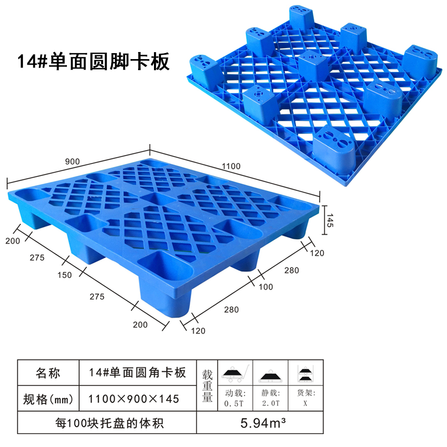 | Color | Low blue,blue,yellow,black,green,red,white,grey,other | Dynamic load | 0.5T | Material | PP,PE | Model | Four-way | Scope | Food pharmaceutical and chemical industries such as textile parts factory warehouse logistics transportation | size | 1100×900×145 | Static load | 2T | Type | Single side | 100 volume | 6m³ | Shelf | X |