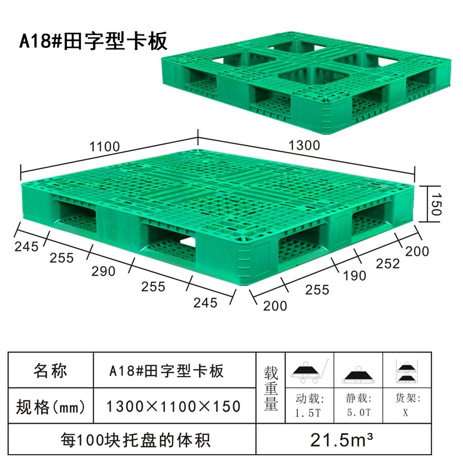 | 可选颜色 | 低兰,兰,黄,黑,绿,红,白,灰,其他 | 动载 | 2T | 材料 | PP,PE | 型式 | 四面进叉 | 适用范围 | 集装、堆放、搬运和运输货物放置、进出口贸易、仓储物流上等 | 尺寸 | 1300×1100×150 | 静载 | 6T | 类型 | 田字 | 百个数量体积 | 21.5m³ | 货架 | √ |