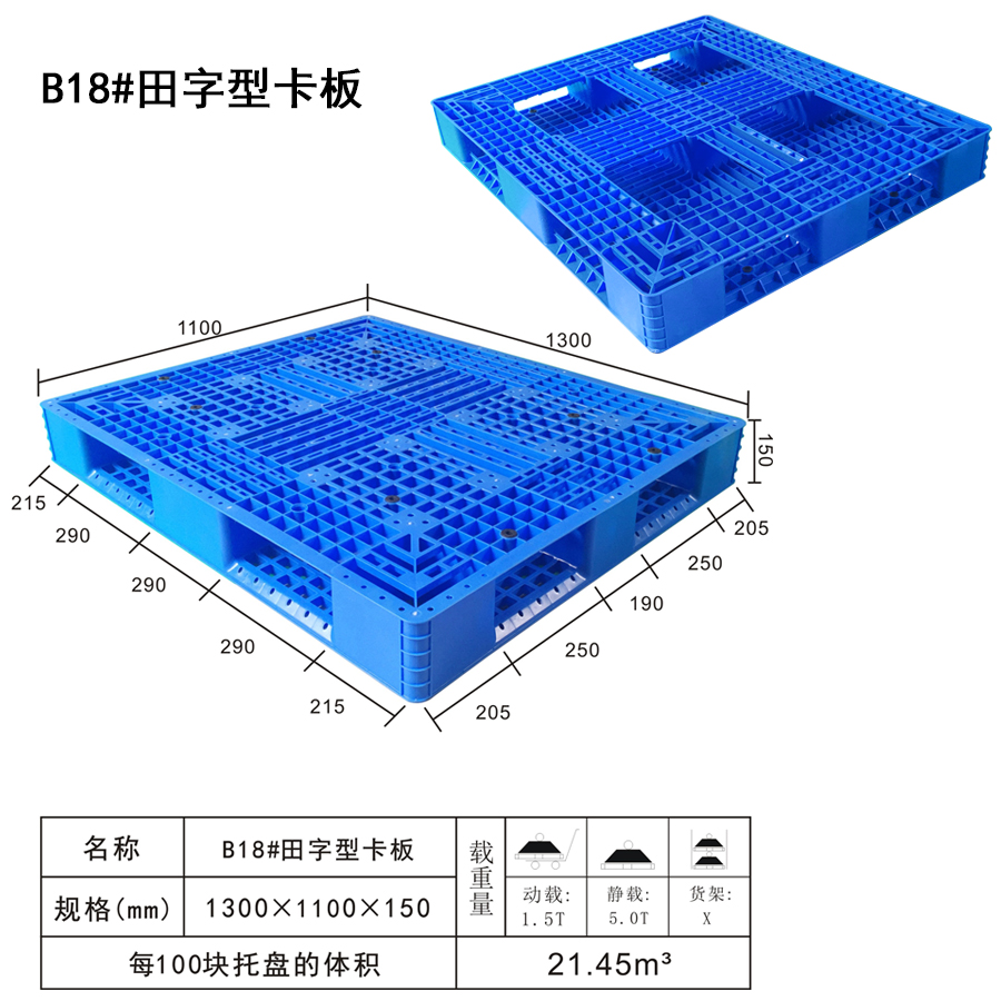 | 可选颜色 | 低兰,兰,黄,黑,绿,红,白,灰,其他 | 动载 | 1.5T | 材料 | PP,PE | 型式 | 四面进叉 | 适用范围 | 集装、堆放、搬运和运输货物放置、进出口贸易、仓储物流上等 | 尺寸 | 1300×1100×150 | 静载 | 5T | 类型 | 田字 | 百个数量体积 | 21.45m³ | 货架 | X |