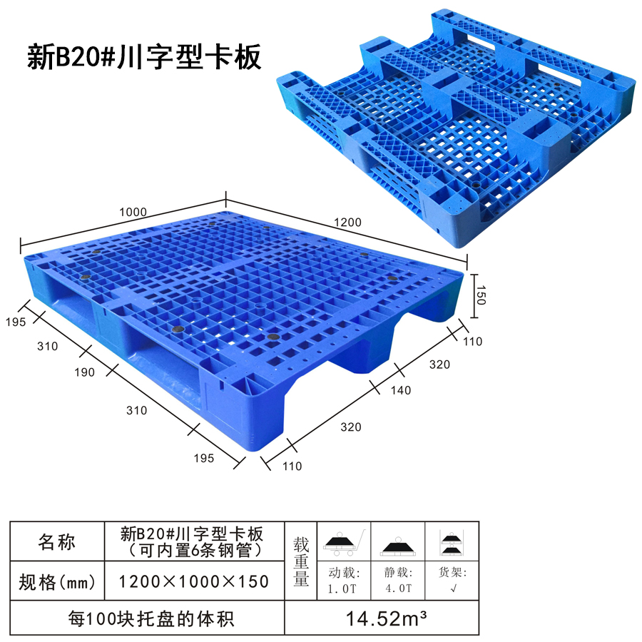 | Color | Low blue,blue,yellow,black,green,red,white,grey,other | Dynamic load | 1T | Material | PP | Model | Four-way | Scope | Pharmaceutical, paper making, printing, electronic and electrical appliances, chemicals, clothing, textiles, warehousing and logistics | size | 1200×1000×150 | Static load | 4T | Type | Sichuan word | 100 volume | 14.52m³ | Shelf | X |