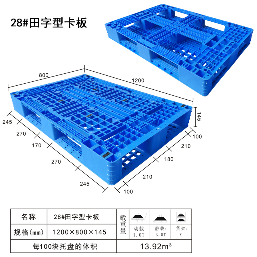 | 可选颜色 | 低兰,兰,黄,黑,绿,红,白,灰,其他 | 动载 | 1T | 材料 | PP,PE | 型式 | 四面进叉 | 适用范围 | 集装、堆放、搬运和运输货物放置、进出口贸易、仓储物流上 | 尺寸 | 1200×800×145 | 静载 | 3T | 类型 | 田字 | 百个数量体积 | 14m³ | 货架 | X |