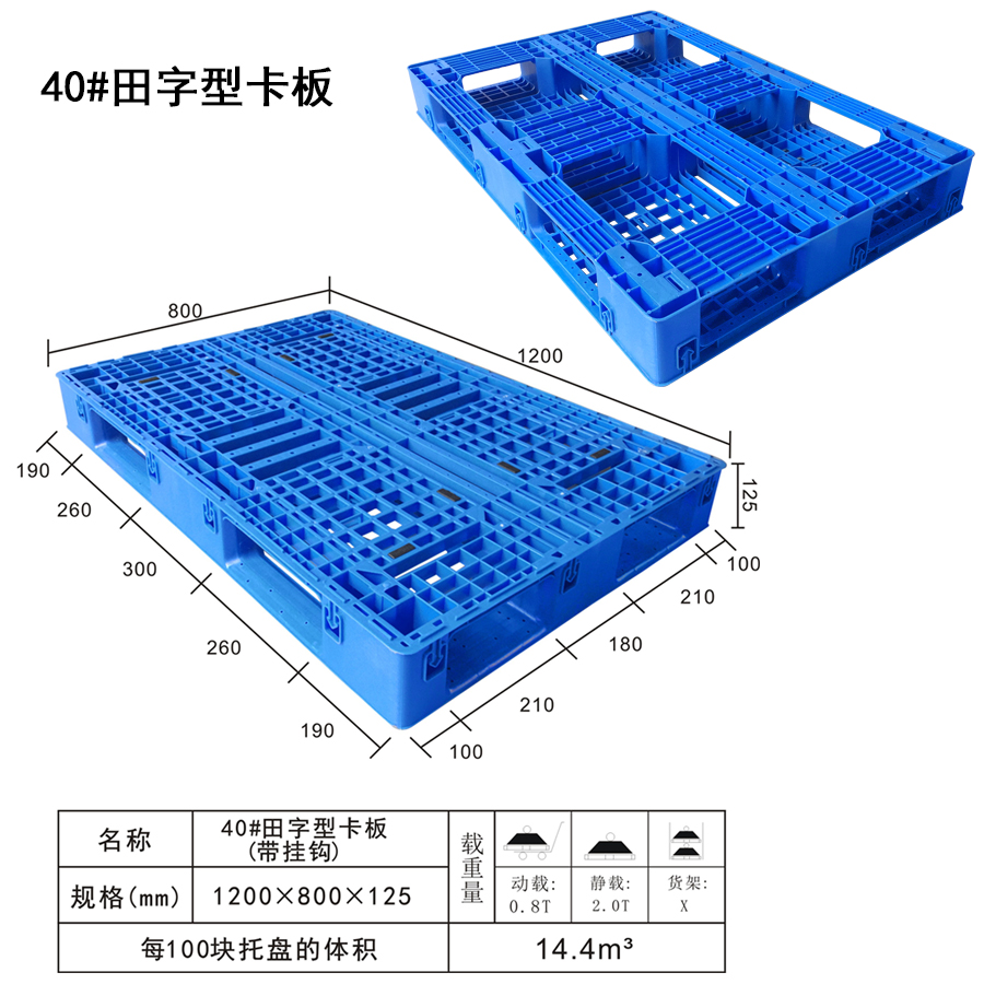 | 可选颜色 | 低兰,兰,黄,黑,绿,红,白,灰,其他 | 动载 | 0.8T | 材料 | PP,PE | 型式 | 四面进叉 | 适用范围 | Container, stacking, handling and transport of goods placed, import and export trade, warehousing and logistics | 尺寸 | 1200×800×125 | 静载 | 2T | 类型 | 田字 | 百个数量体积 | 14.4m³ | 货架 | X |