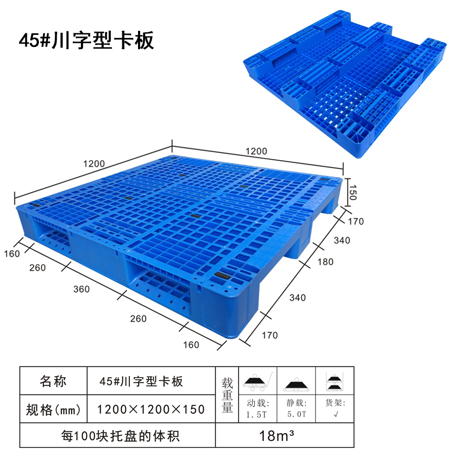 | 可选颜色 | 低兰,兰,黄,黑,绿,红,白,灰,其他 | 动载 | 1.5T | 材料 | PP,PE | 型式 | 四面进叉 | 适用范围 | 医药、造纸、印刷、电子电器、化工、服装、纺织、仓储物流等行业 | 尺寸 | 1200×1200×150 | 静载 | 5T | 类型 | 川字 | 百个数量体积 | 18m³ | 货架 | √ |