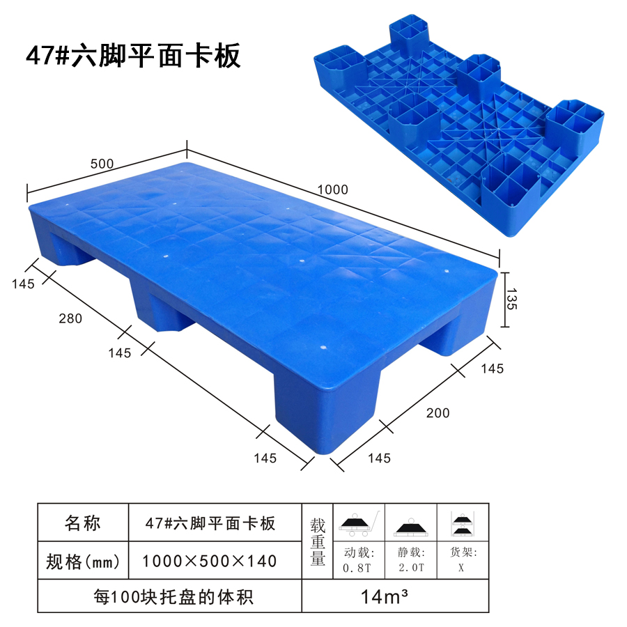 | Color | Low blue,blue,yellow,black,green,red,white,grey,other | Dynamic load | 0.8T | Material | PP,PE | Model | Two-way | Scope | Textile factory, food factory, pharmaceutical factory and other enterprise applications | size | 1000×500×140 | Static load | 2T | Type | 100 volume | 14m³ | Shelf | X |