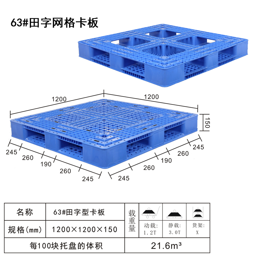 | 可选颜色 | 低兰,兰,黄,黑,绿,红,白,灰,其他 | 动载 | 1.2T | 材料 | PP,PE | 型式 | 四面进叉 | 适用范围 | 集装、堆放、搬运和运输货物放置、进出口贸易、仓储物流上等 | 尺寸 | 1200×1200×150 | 静载 | 3T | 类型 | 田字 | 百个数量体积 | 21.6m³ | 货架 | X |
