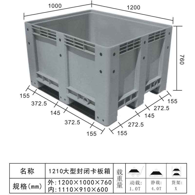 | 可选颜色 | 低兰,兰,黄,黑,绿,红,白,灰,其他 | 动载 | 1T | 材料 | PP,PE | 型式 | 四面进叉 | 适用范围 | 各种零部件和原料的包装,储存和运输 | 尺寸 | 1200×1000×760 | 静载 | 4T | 类型 | 周转箱 | 百个数量体积 | -- | 货架 | -- |