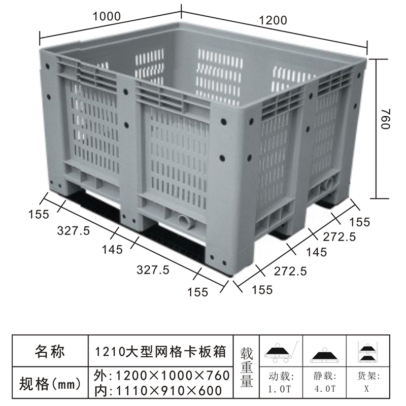 | Color | Low blue,blue,yellow,black,green,red,white,grey,other | Dynamic load | 1T | Material | PP,PE | Model | Four-way | Scope | Packaging, storage and transportation of various components and raw materials | size | 1200x1000x760 | Static load | 4T | Type | Turnover box | 100 volume | -- | Shelf | -- |