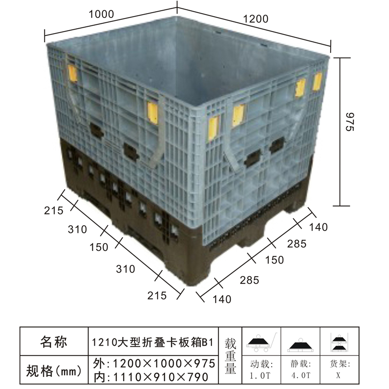 | 可选颜色 | 低兰,兰,黄,黑,绿,红,白,灰,其他 | 动载 | 1T | 材料 | PP,PE | 型式 | 四面进叉 | 适用范围 | 各种零部件和原料的包装,储存和运输 | 尺寸 | 1200x1000x975 | 静载 | 4T | 类型 | 周转箱 | 百个数量体积 | -- | 货架 | -- |