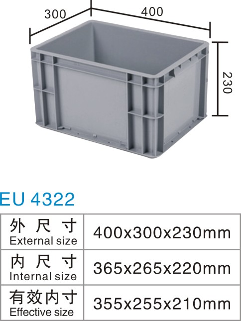 | Color | Low blue,blue,grey | Dynamic load | -- | Material | PP,PE | Model | -- | Scope | size | Distribution of machinery manufacturing, parts and components | Static load | -- | Type | EU box | 100 volume | -- | Shelf | -- |