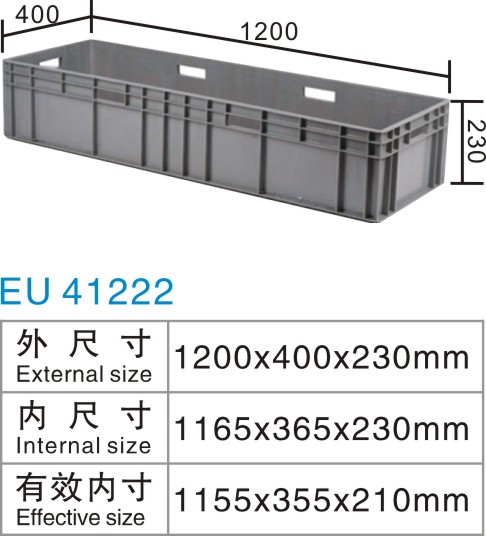| Color | Low blue,blue,grey | Dynamic load | -- | Material | PP,PE | Model | -- | Scope | Distribution of machinery manufacturing, parts and components | size | 1200×400×230 | Static load | -- | Type | EU box | 100 volume | -- | Shelf | -- |