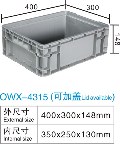 | Color | Low blue,blue | Dynamic load | -- | Material | PP,PE | Model | -- | Scope | TOYOTA automobile main engine factory and its supporting parts manufacturing factory | size | 400×300×148 | Static load | -- | Type | EU box | 100 volume | -- | Shelf | -- |