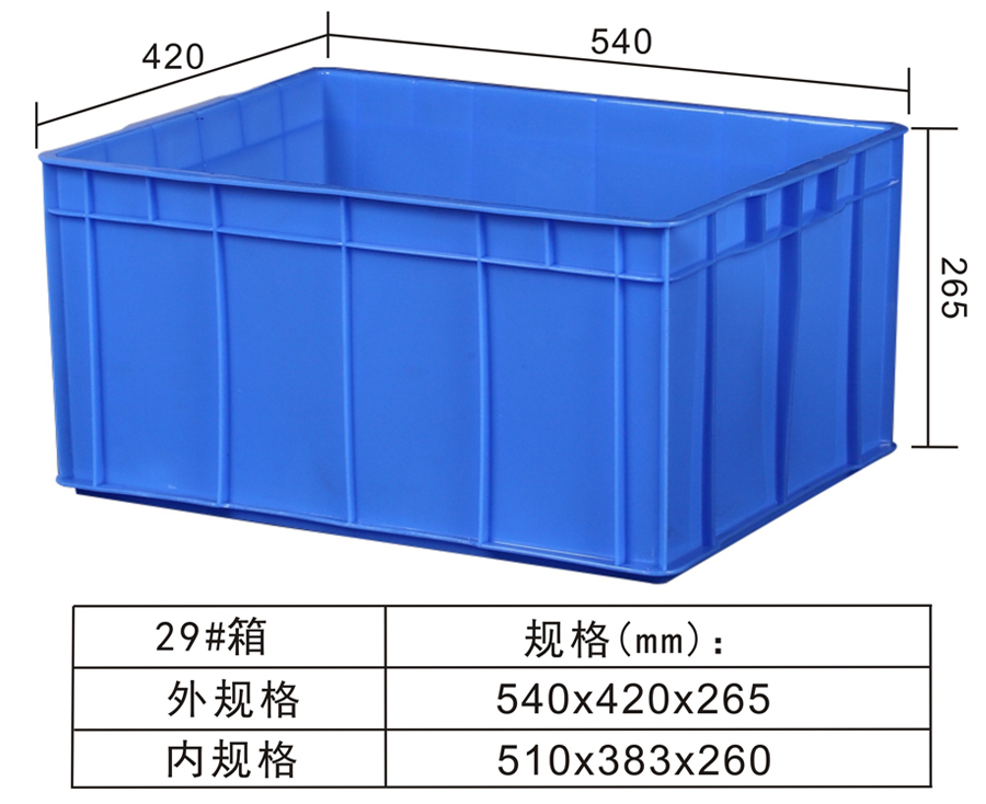 | 可选颜色 | 低兰,兰,黄,黑,绿,红,白,灰,其他 | 动载 | -- | 材料 | PP,PE | 型式 | -- | 适用范围 | 零售业、生产线、物流配送业 | 尺寸 | 540×420×265 | 静载 | -- | 类型 | 周转箱 | 百个数量体积 | 6m³ | 货架 | -- |