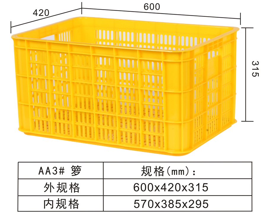 | Color | Low blue,blue,yellow,black,green,red,white,grey,other | Dynamic load | -- | Material | PP,PE | Model | -- | Scope | Fruits, vegetables, machinery parts, refrigeration, storage, transportation and other industries | size | 600×420×315 | Static load | -- | Type | Turnover basket | 100 volume | 8m³ | Shelf | -- |