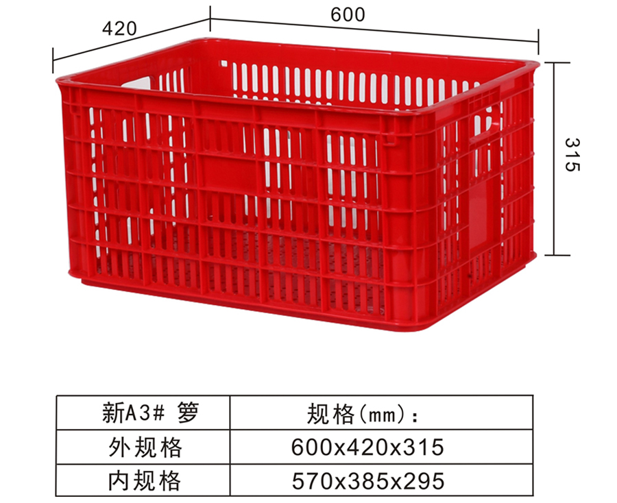 | Color | Low blue,blue,yellow,black,green,red,white,grey,other | Dynamic load | -- | Material | PP,PE | Model | -- | Scope | Fruits, vegetables, machinery parts, refrigeration, storage, transportation and other industries | size | 600×420×315 | Static load | -- | Type | Turnover basket | 100 volume | 8m³ | Shelf | -- |