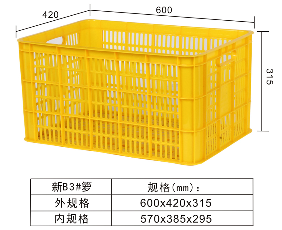 | 可选颜色 | 低兰,兰,黄,黑,绿,红,白,灰,其他 | 动载 | -- | 材料 | PP,PE | 型式 | -- | 适用范围 | 水果、蔬菜、机械零配件、冷藏、储存、运输等行业 | 尺寸 | 600×420×315 | 静载 | -- | 类型 | 周转箩 | 百个数量体积 | 8m³ | 货架 | -- |
