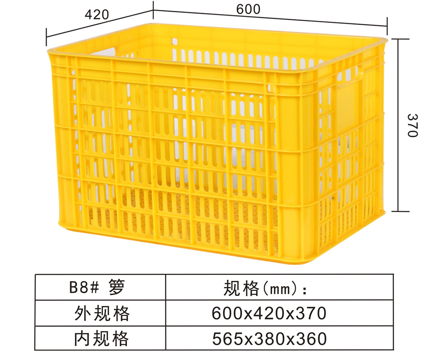 | 可选颜色 | 低兰,兰,黄,黑,绿,红,白,灰,其他 | 动载 | -- | 材料 | PP,PE | 型式 | -- | 适用范围 | 水果、蔬菜、机械零配件、冷藏、储存、运输等行业 | 尺寸 | 600×420×370 | 静载 | -- | 类型 | 周转箩 | 百个数量体积 | 9m³ | 货架 | -- |