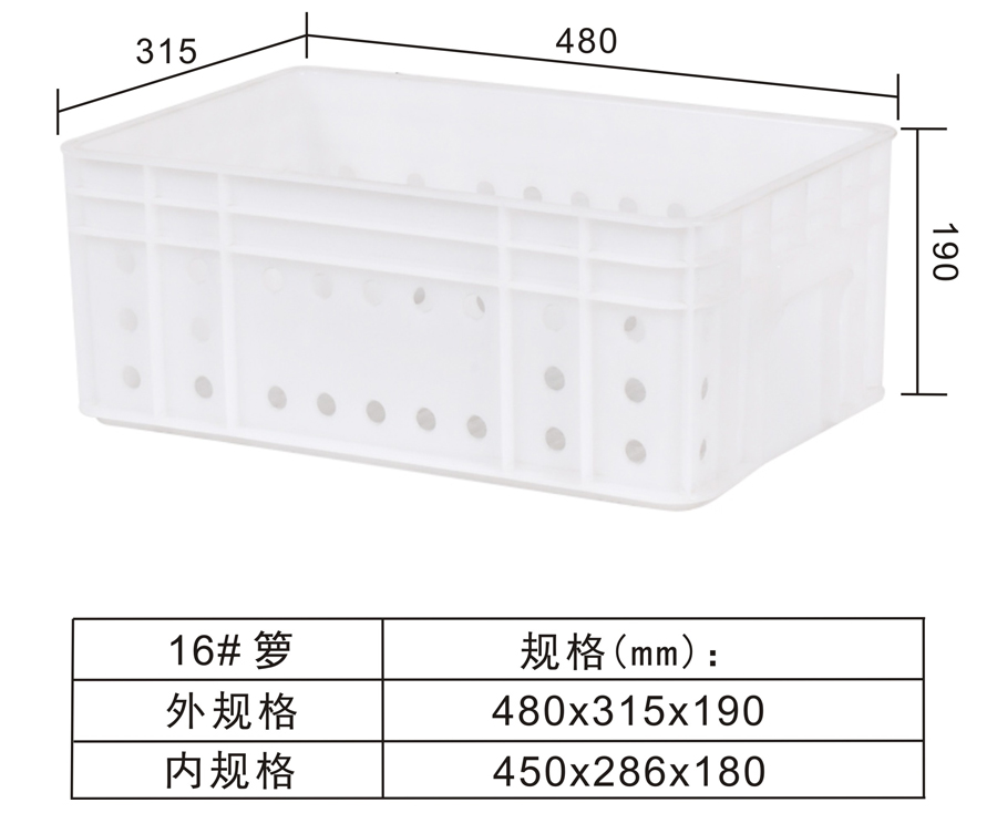 | Color | Low blue,blue,yellow,black,green,red,white,grey,other | Dynamic load | -- | Material | PP,PE | Model | -- | Scope | Fruits, vegetables, machinery parts, refrigeration, storage, transportation and other industries | size | 480×315×190 | Static load | -- | Type | Turnover basket | 100 volume | 3m³ | Shelf | -- |