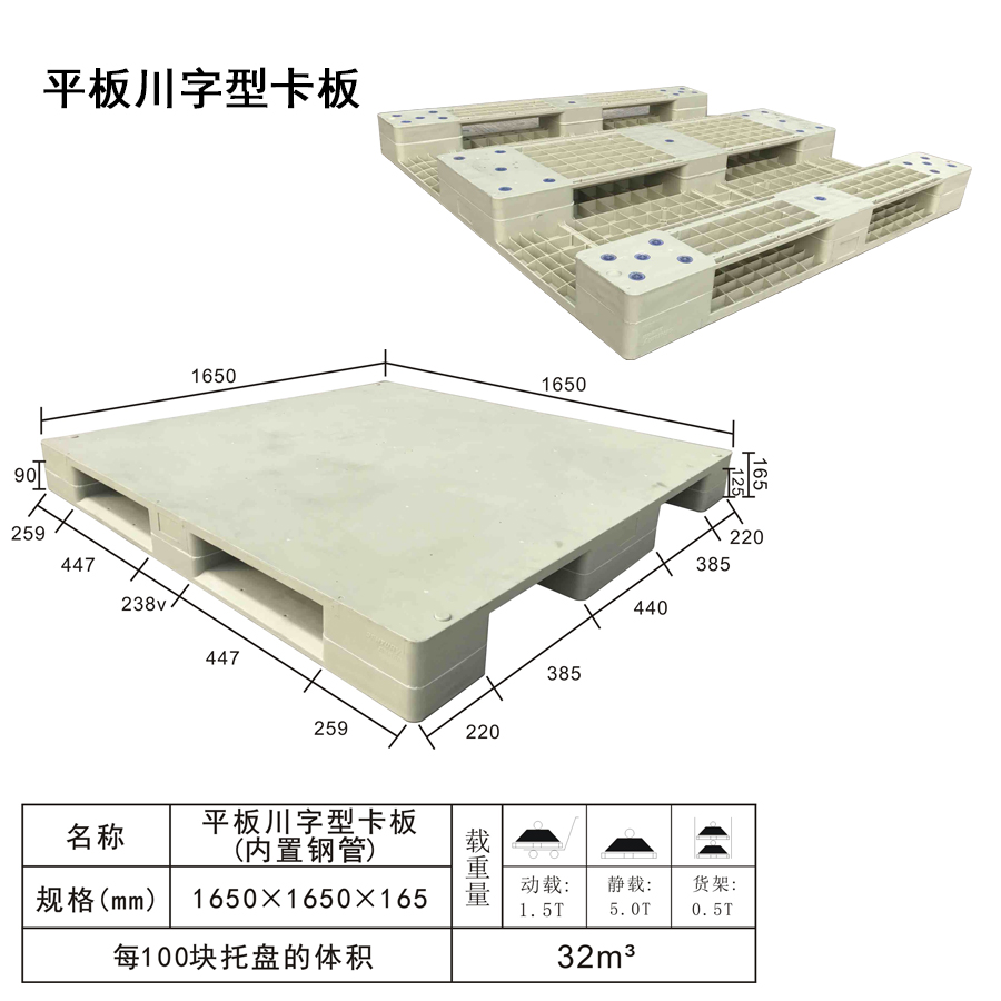 | Color | Low blue,blue,yellow,black,green,red,white,grey,other | Dynamic load | 1.5T | Material | PP,PE | Model | Four-way | Scope | Pharmaceutical, paper making, printing, electronic and electrical appliances, chemicals, clothing, textiles, warehousing and logistics | size | 1650×1650×165 | Static load | 5T | Type | Sichuan word | 100 volume | 32m³ | Shelf | 1T |