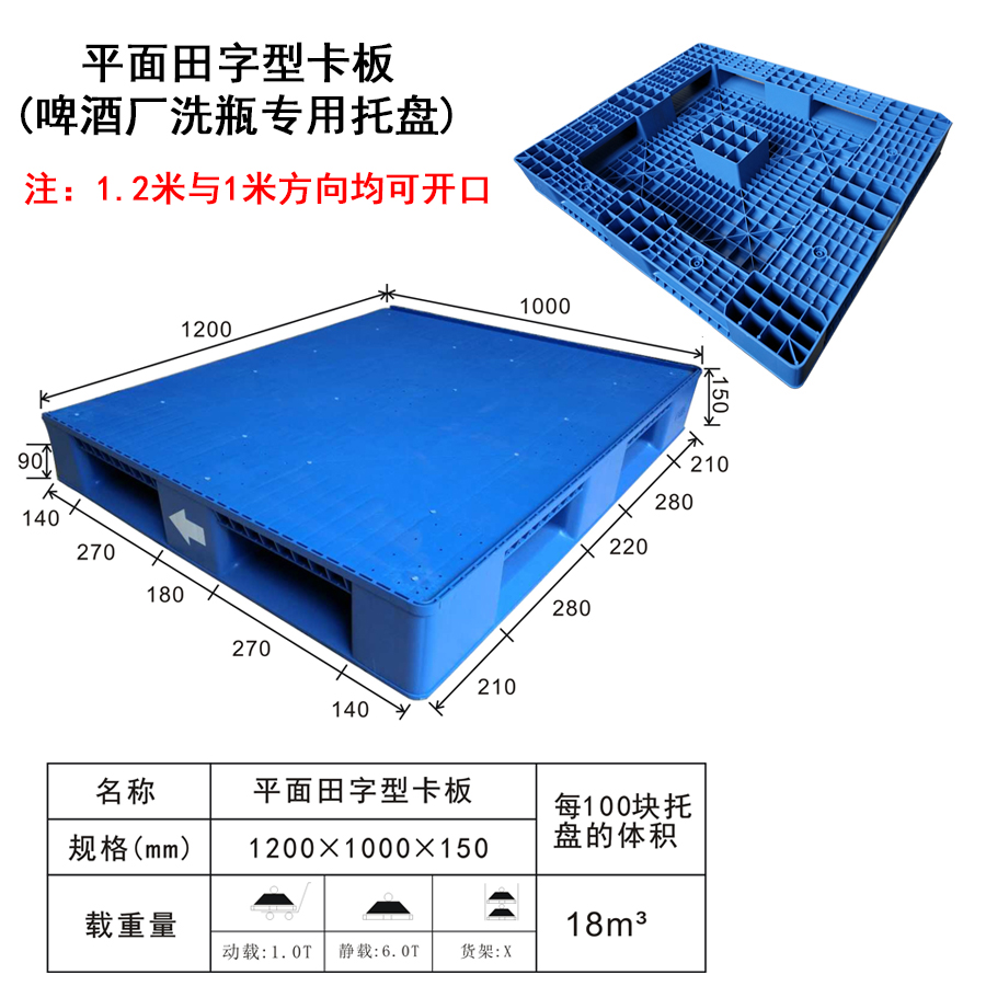 | Color | Low blue,blue,yellow,black,green,red,white,grey,other | Dynamic load | 1T | Material | PP,PE | Model | Four-way | Scope | Special tray for beer factory | size | 1200×1000×150 | Static load | 6T | Type | Tian word | 100 volume | 18m³ | Shelf | X |